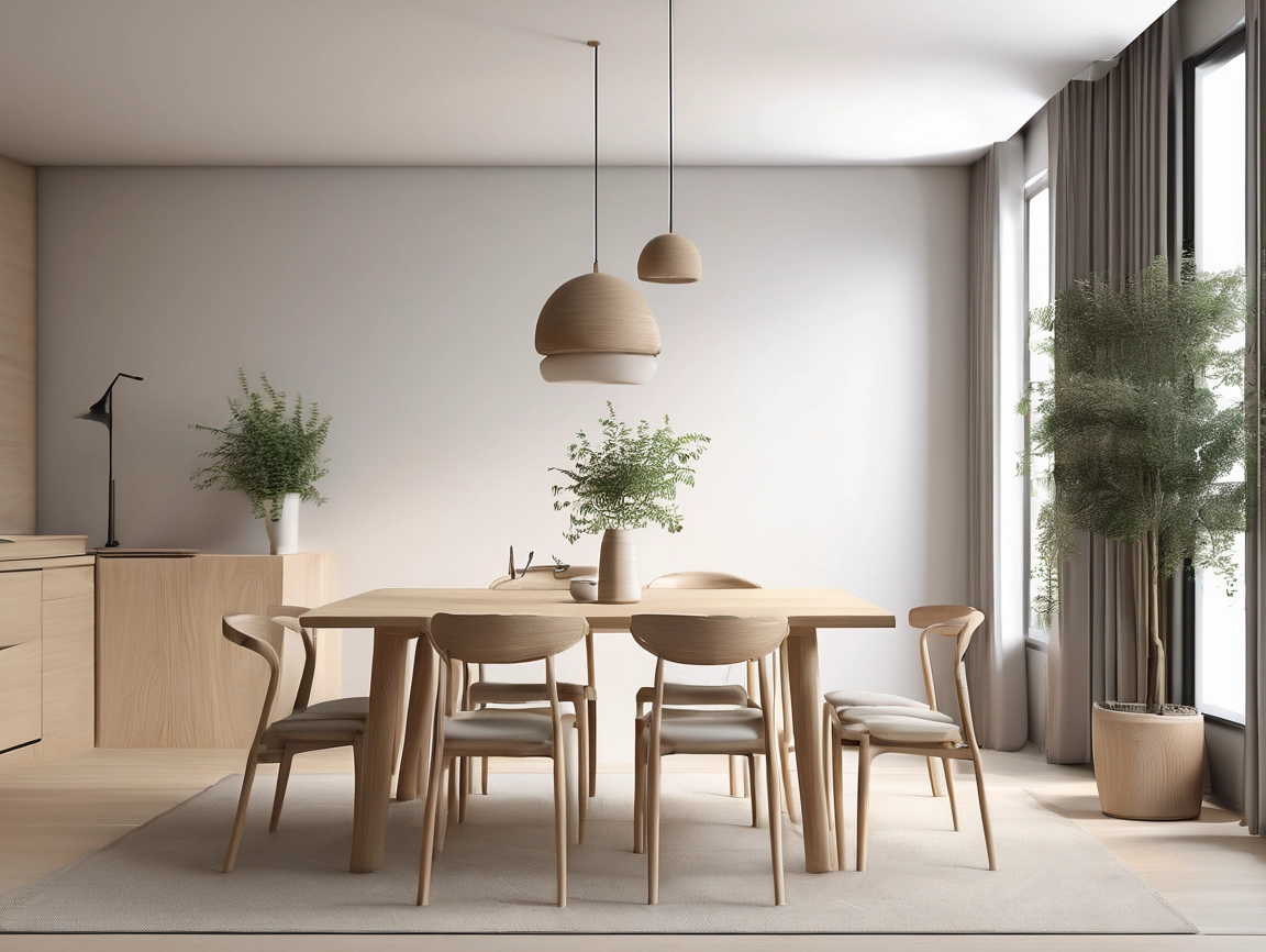 Image Suggestion: A minimalist Japandi dining room with a light natural wood table, mismatched chairs, and a single, elegant plant.