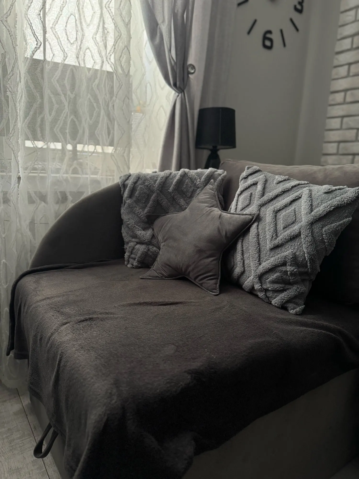 - Features a geometric jacquard pattern in understated shades of gray, white, and beige for a timeless, minimalist look