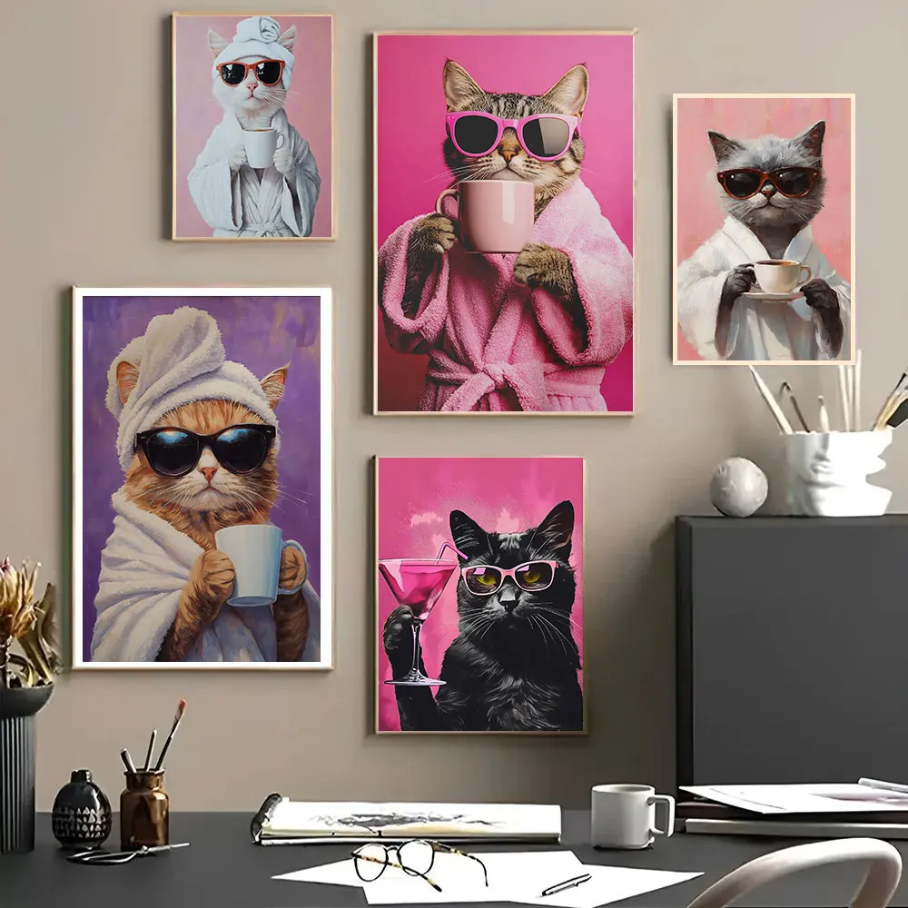 Animal Pink Cat Drinking Coffee Posters Canvas Painting Print Cat Art Room Home Kitchen Bar Cafe Room Wall Decor