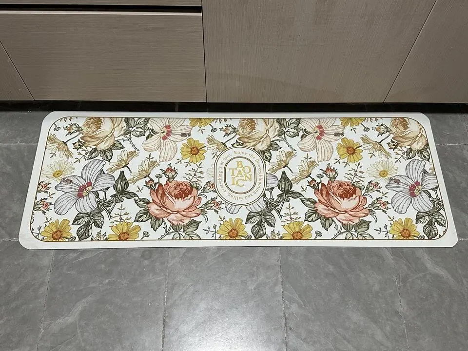 The floor mat you are looking at now is professionally used in the kitchen. Its fabric is leather PVC. Its main feature is waterproof, oil-proof and non-slip. At the same time, its soft and resilient fabric can also protect the tableware from being broken due to falling.