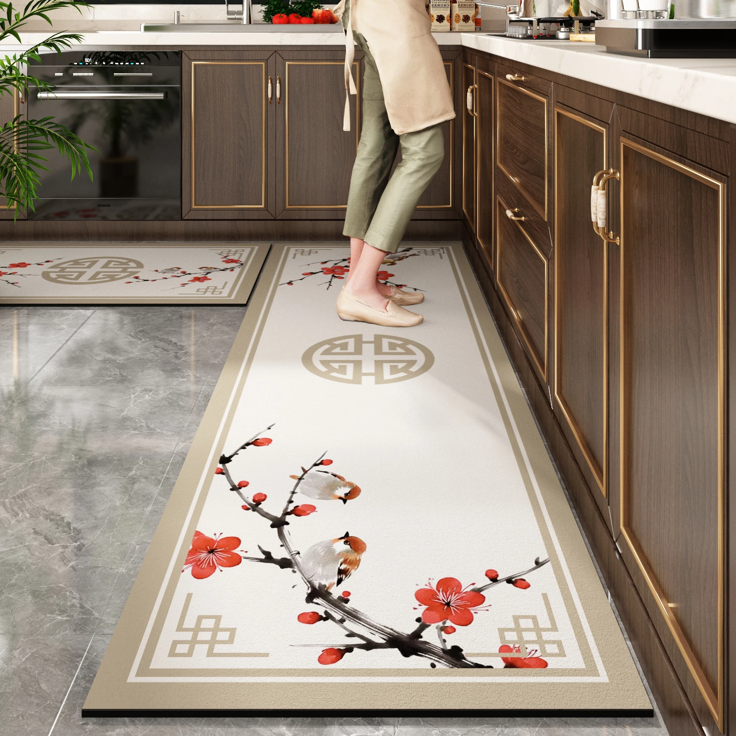Chinese Style Kitchen Rug Waterproof Non-slip Carpet Flower Bird Pattern PVC Long Rugs Retro Ethnic Style Home Decor Floor Mat
