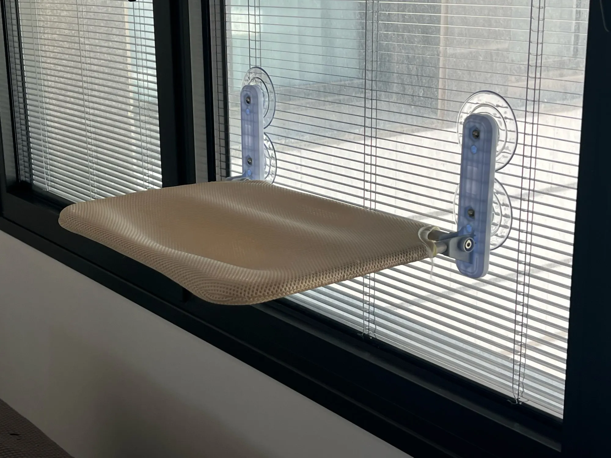 Give your cat the gift of comfort with the Sunshine Bliss Foldable Suction Cup Cat Hammock Bed. Made with breathable materials, this stylish gray and beige hammock provides a cozy spot for lounging. Its sturdy metal construction ensures durability, while the foldable design makes it easy to store. Perfect for any cat to relax in style.