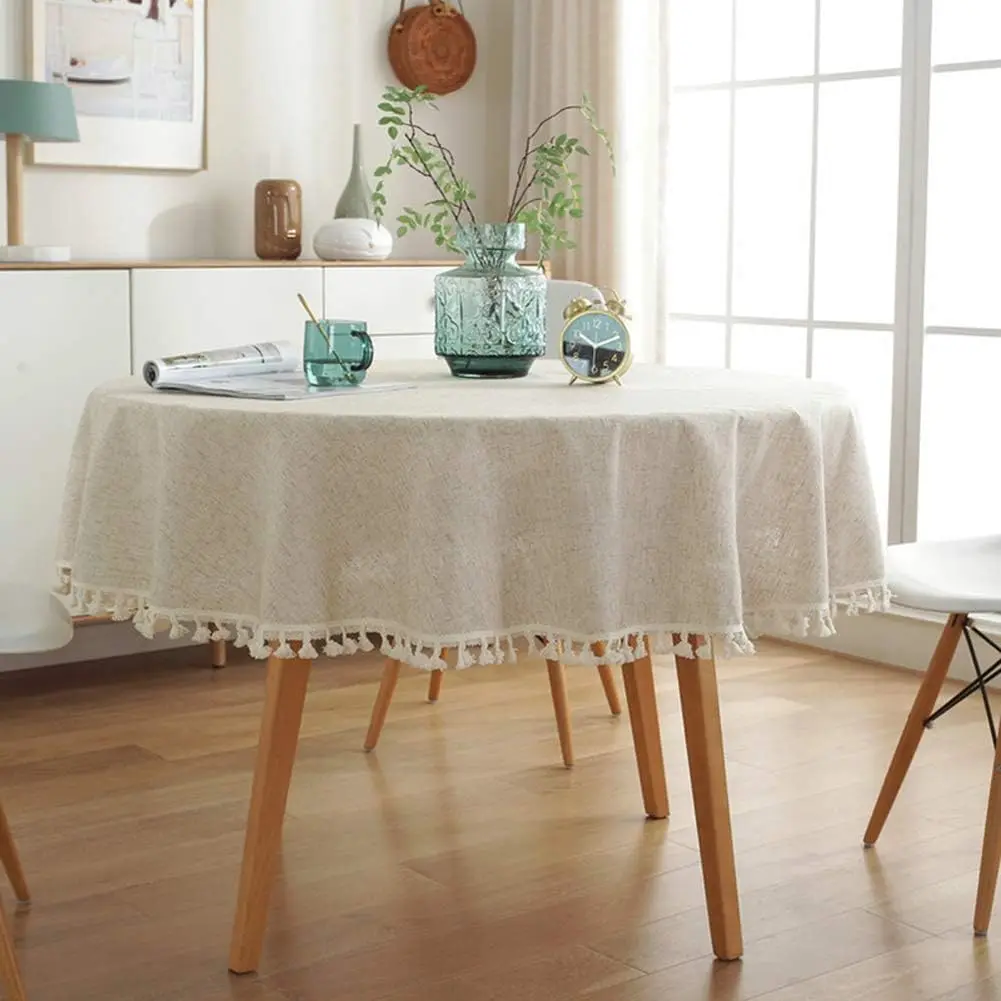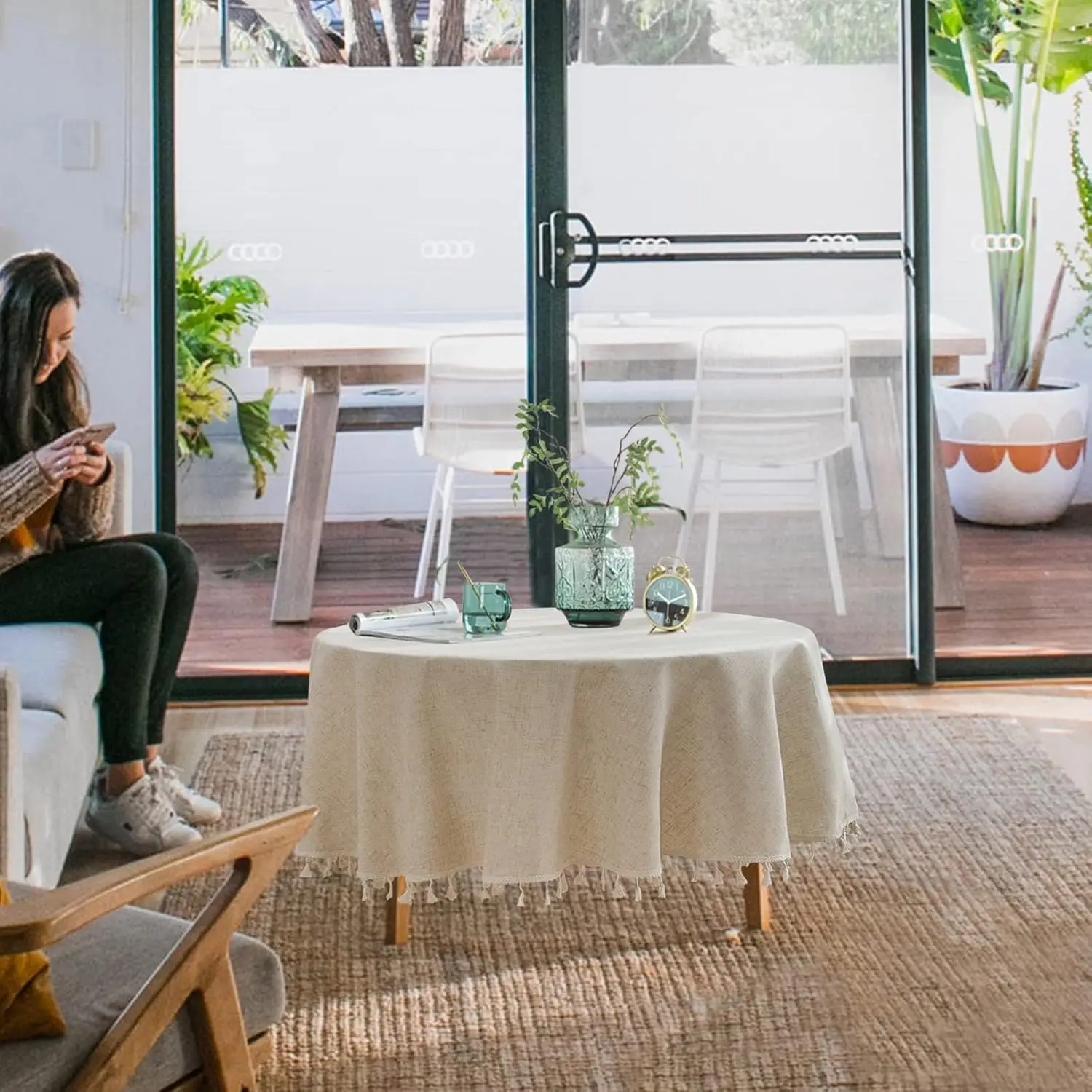 Cotton Linen Round Tablecloth, Farmhouse Dust-Proof Tablecloth,Soft and Wrinkle Free Table Cover with Tassels for Kitchen Dining