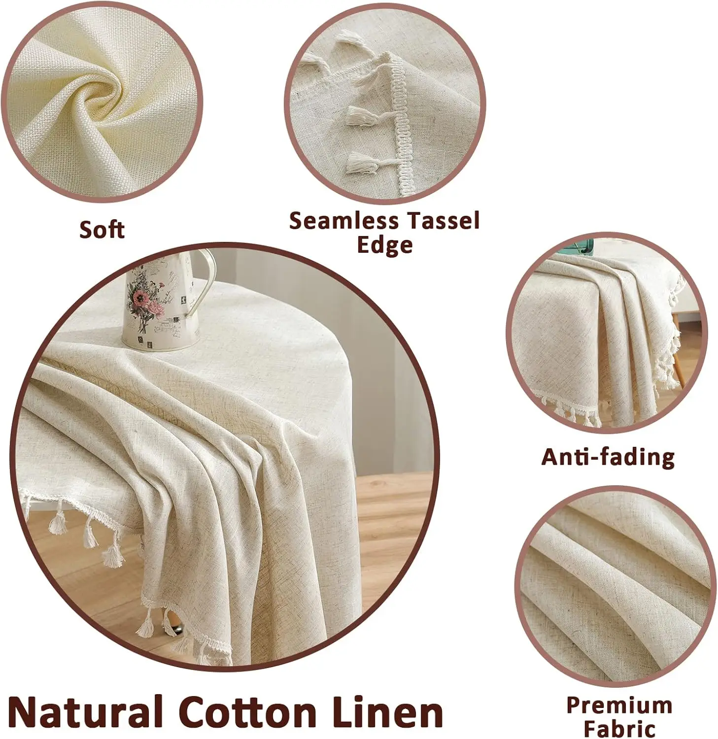 Table Cloth 60 Inch Round Table, Heavy Duty Linen Look Dust-Proof Tablecloths Farmhouse Tablecloth, Soft and Wrinkle Free Table Cover with Beige Tassels for Kitchen Dining, Party