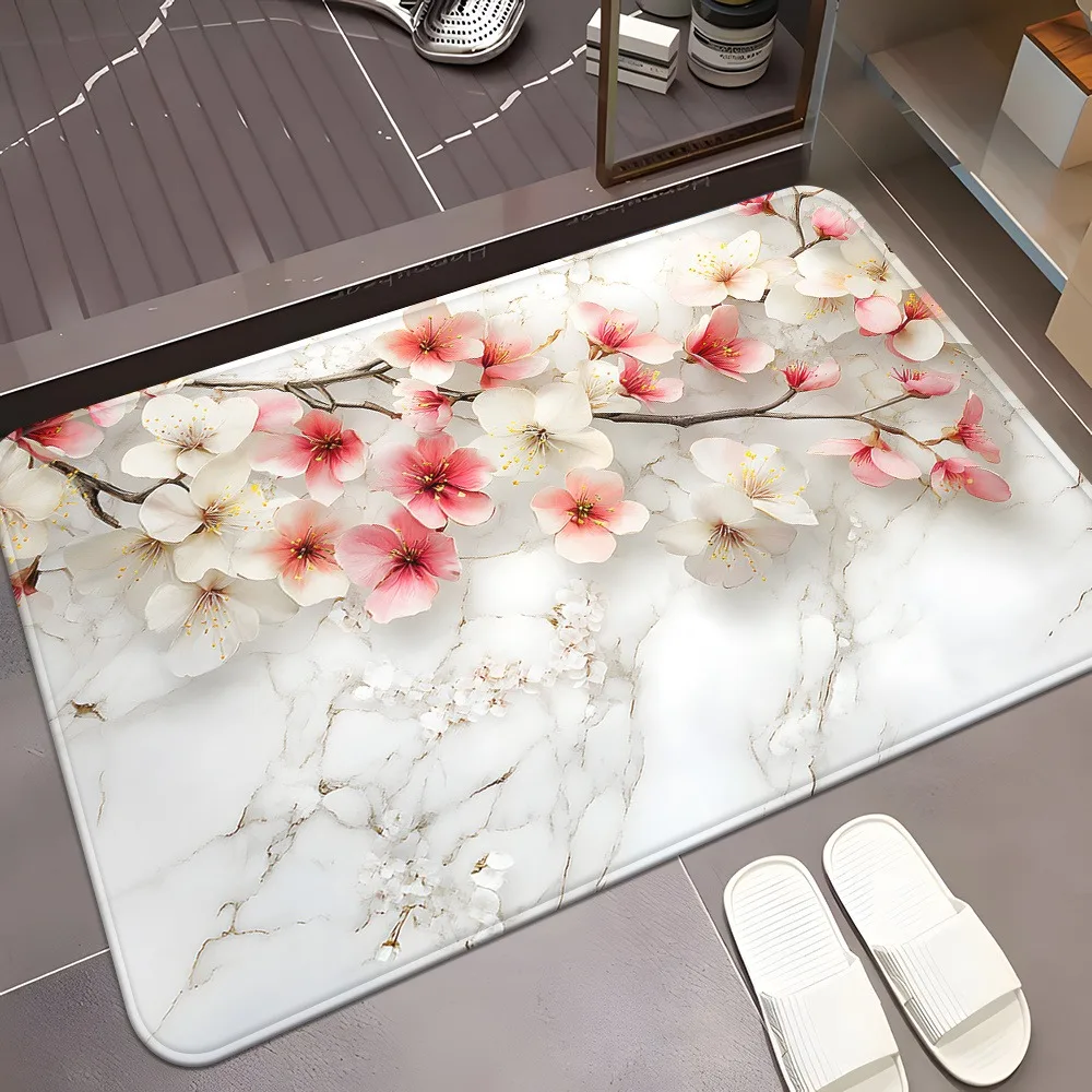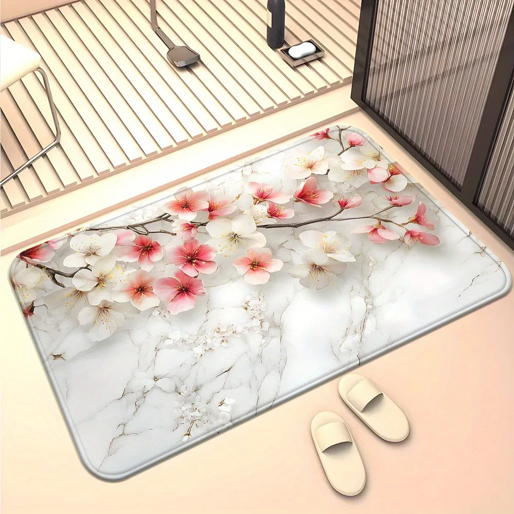 Elegant Cherry Blossom & Marble Bath Mat, Soft Bathroom Floor Rug, Non-Slip Absorbent Home Decor Mat