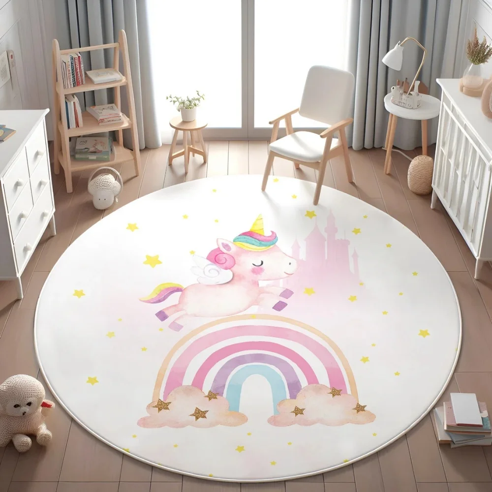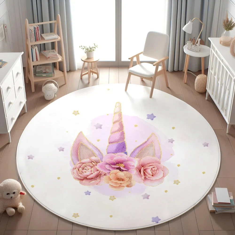 Enchanted Unicorn Floral Round Rug for Home Decor Magical Rainbow Playful Floor Mat for Kids Nursery Bedroom Fantasy Decor