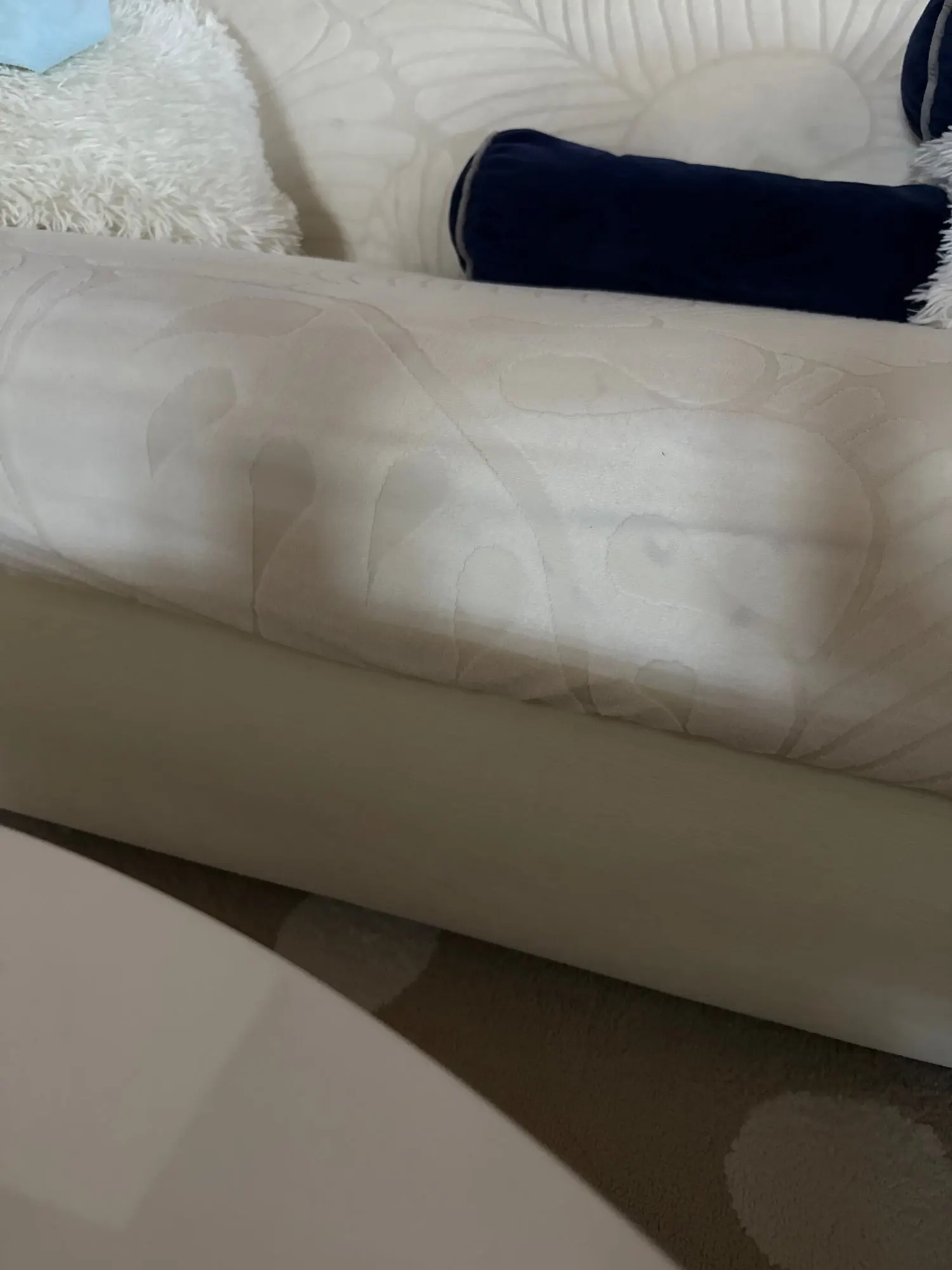 These sofa covers are really beautiful and I am satisfied. No smell, but I washed them anyway before putting them on. I want to clarify that in the photo it looks like a damask fabric but in reality they are soft like sponge and where there is no embossed "design", they show the color of the sofa or at least, as in my case, the design of the sofa (mine is light beige with a splash of small colored shapes). The color is not creamy white but a full-fat milk cream color. Arrived earlier than expected.