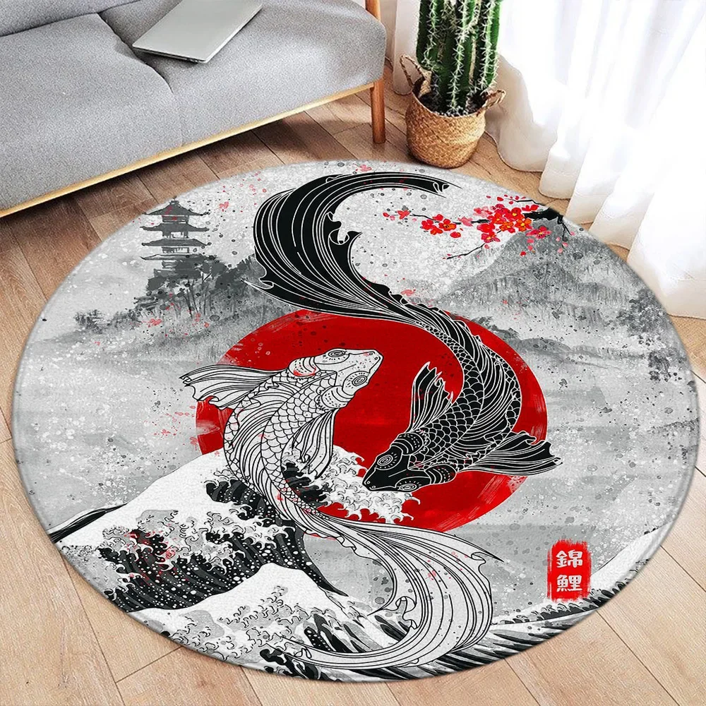 Japanese Style Round Carpet Koi Fish Lotus Cherry Blossom Flower Mountain Water Ink Art Home Living Room Bedroom Decor Floor Rug