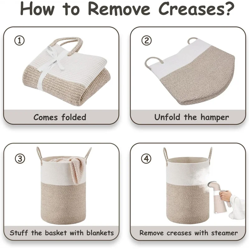 The laundry basket is folded to improve transportation efficiency. Simply fill it with blankets or other fluffy objects and steam it gently to restore the perfect round shape.