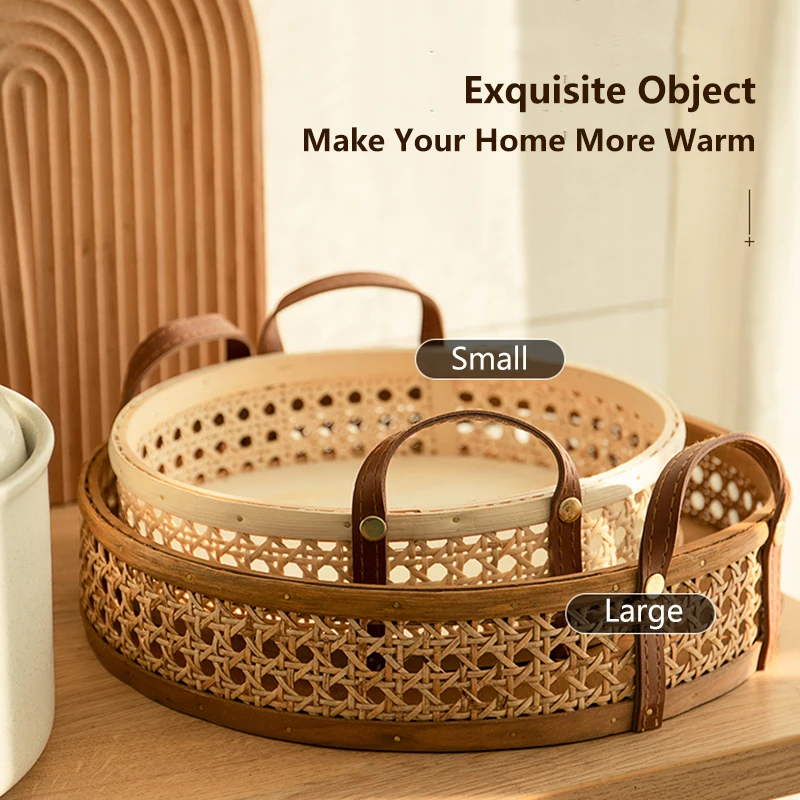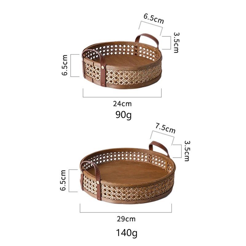 Handcrafted Nordic rattan tray with leather handles combines eco-friendly design and versatile storage. Perfect for organizing fruit, bread, or sundries on any desktop. Lightweight, stylish, and portable—ideal for home, parties, or gifting. Choose from multiple sizes and colors.