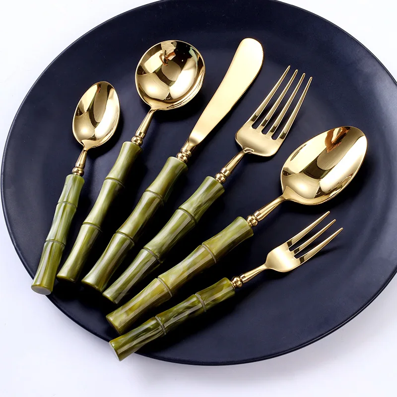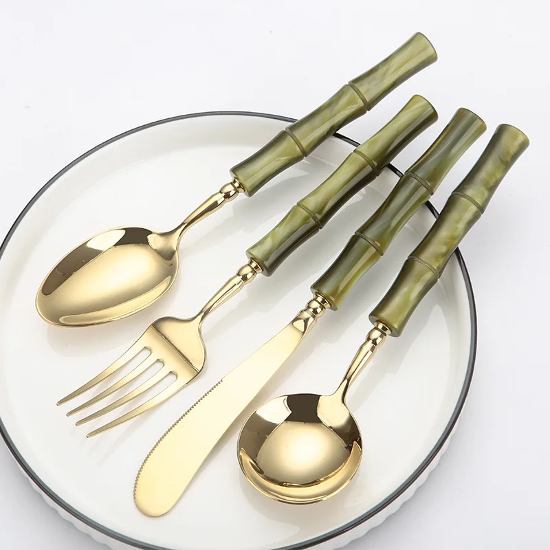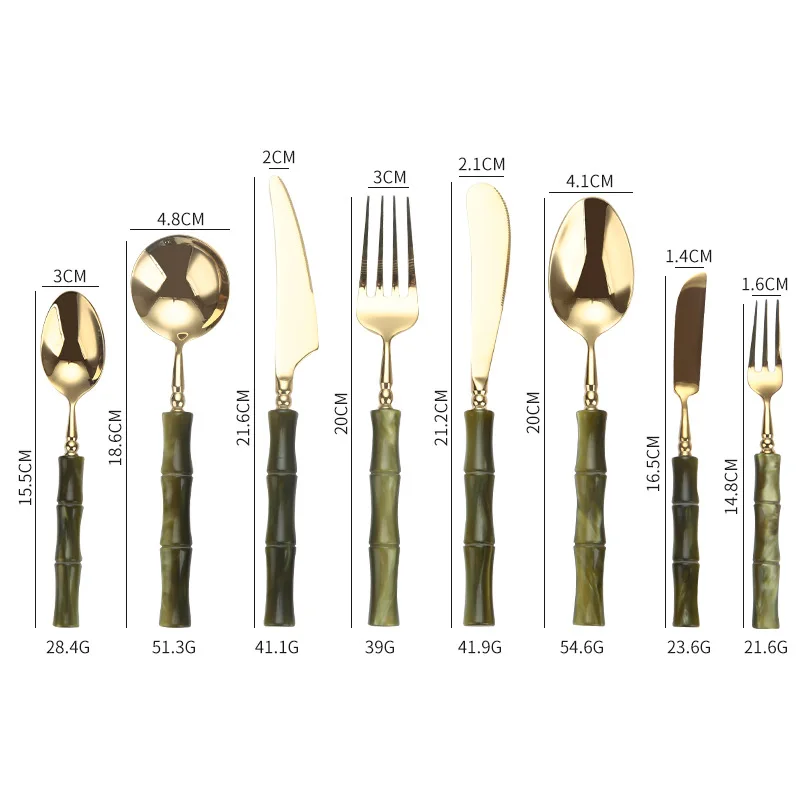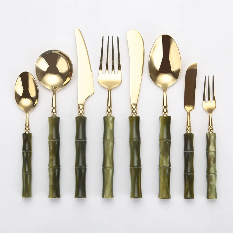 Premium 304 stainless steel cutlery set with gold plating and olive green acrylic handles. Durable, eco-friendly design perfect for stylish dining, weddings, or gifts. Includes knife, fork, spoon, and more for a complete luxury table experience.