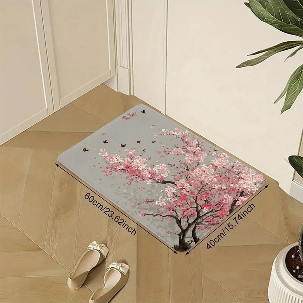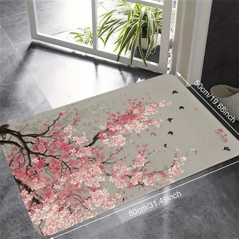 Oriental Cherry Blossom & Butterfly Bath Mat, Zen-Style Bathroom Floor Rug, Non-Slip Absorbent Home Decor Mat