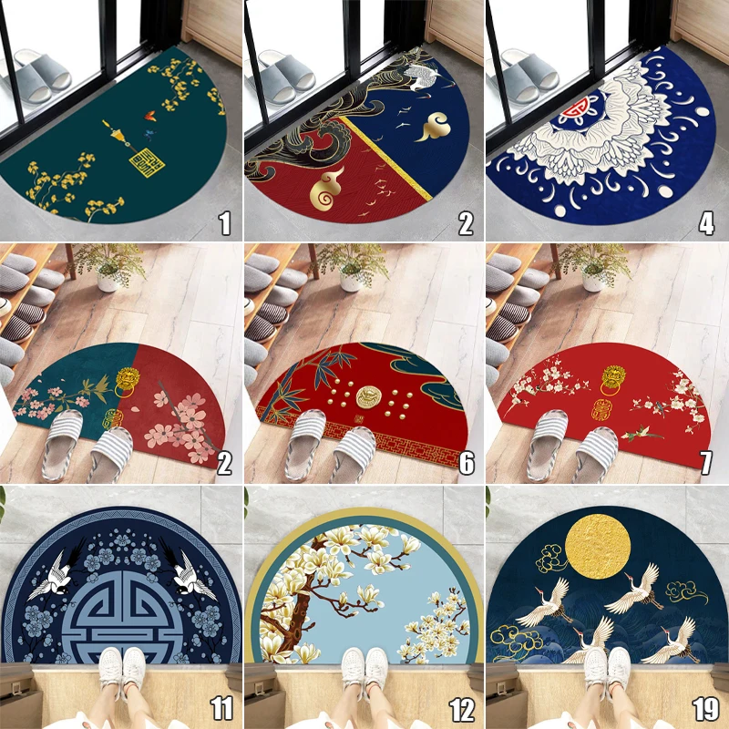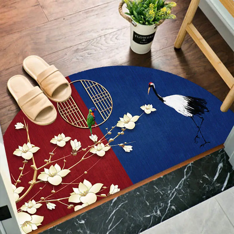 Semi-circular Floor Mats Retro Japanese Style Crane Printed Door Entrance Non-slip Floor Mats Balcony Carpet Hallway Porch Rug