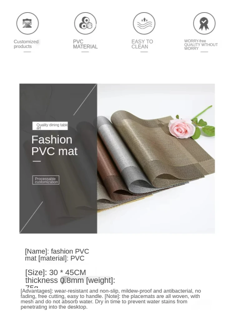 Crafted from high-quality PVC, these placemats are free from harmful chemicals and safe for everyday use. Their water-resistant surface allows for quick and simple cleaning—just wipe with a damp cloth to remove any dirt or stains. The lightweight and flexible design makes storage and handling effortless. Suitable for both home and cafe settings, these mats combine form and function in a refined way.