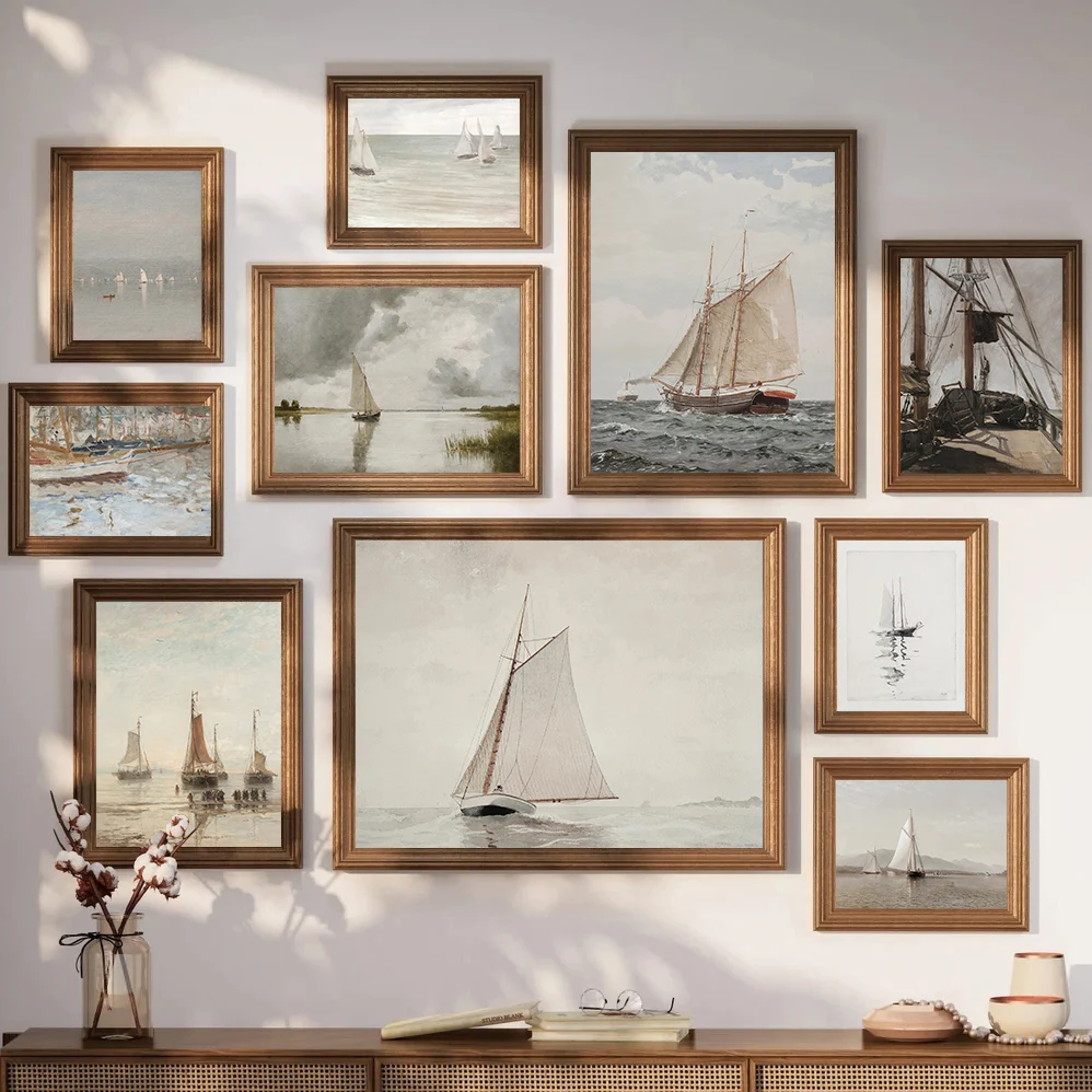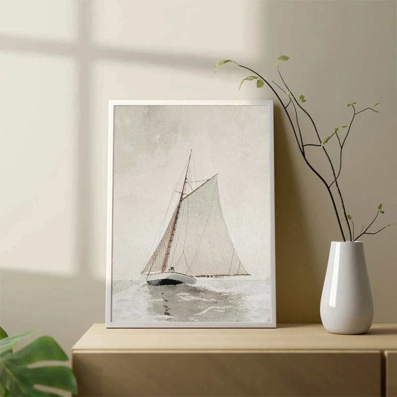 Vintage Neutral Sailboat Print Antique Nautical Sketch Art Poster Coastal Seascape Wall Art Canvas Painting Lake House Decor